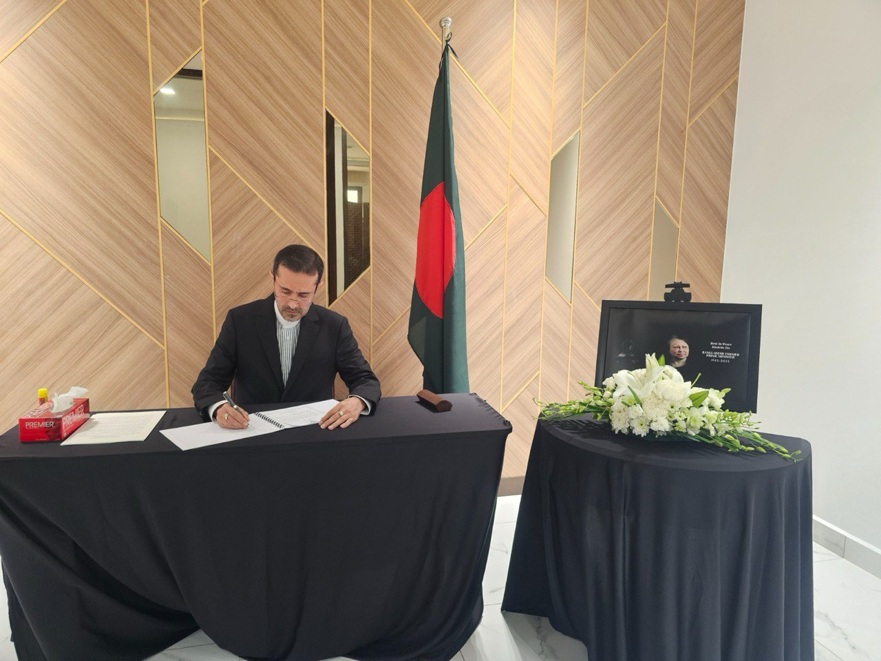 امضاء دفتر یادبود درگذشت خالده ضیا سفارت بنگلادش در بندر سری بگاوان توسط سفیر جمهوری اسلام...