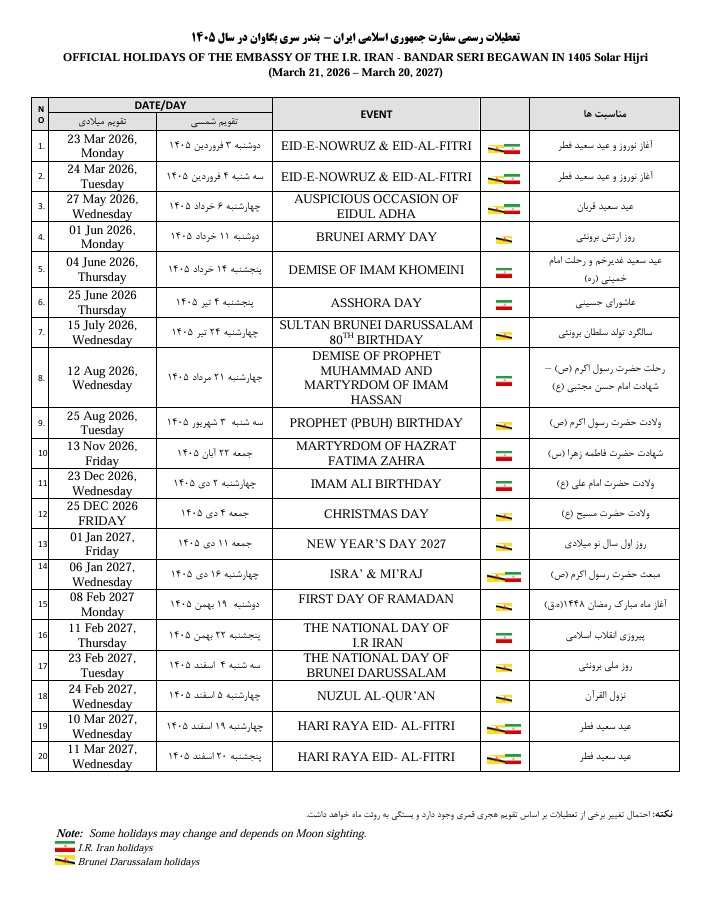 اطلاعات کلی و توصیههای سفر به برونئی دارالسلام پایتخت: بندر سری بگاوان - زبان رسمی: مالایی (زبان انگلیسی و ماندرین چینی نیز در این کشور رایج است) -واحد پول: دلار برونئی (BND) . ارزش دلار برونئی با دلار سنگاپور برابر است، از این رو دلار سنگاپور نیز در کلیه فروشگاه های برونئی پذیرفته می شود. - کد تلفن بین المللی: 00673- اختلاف ساعت با تهران: چهار ساعت و نیم (جلوتر از ایران) - فرودگاه بینالمللی: فرودگاه بینالمللی برونئی دارالسلام- شماره های اضطراری: 123 شماره اضطراری (پلیس 993، آتش نشانی 995، آمبولانس 991) - شماره تلفن سفارت جمهوریاسلامیایران در برونئی دارالسلام: 2424873 – 2424874 - شماره تلفن همراه کنسول سفارت در مواقع بسیار ضروری: 7372977 توصیه های سفر: 1. شماره تلفنهای سفارت جمهوری اسلامی در برونئی دارالسلام و تلفن همراه کنسول سفارت و همچنین شماره تلفن هتل محل اقامت خود را در دسترس داشته باشید. 2. هنگام سفر از تمامی صفحات گذرنامه و ویزای خود فتوکپی رنگی تهیه نموده و در محل اقامت خود نگهداری کرده تا در صورت سرقت یا مفقود شدن گذرنامه از آن استفاده نمایید و حتی علاوه بر فتوکپی میتوانید مدارک خود را اسکن و همراه خود داشته باشید. در صورت مفقود شدن گذرنامه سریعا آن را به پلیس محلی اعلام و از آنان گواهی اعلام مفقودیت دریافت نمایید. 3. در هتل از وسایل و گذرنامه خود مراقبت کامل داشته باشید. 4. آب لوله کشی برونئی آشامیدنی نیست و حتما باید از دستگاه های خاص تسویه آب آشامیدنی استفاده شود. برای این منظور از فروشگاهها آب معدنی خریداری کنید. 5. از عبور و توقف در کنار آب ها جداً خودداری کنید، احتمال وجود پشه دنگی و کروکدیل در این کشور وجود دارد. 6. از انجام تجارت و یا اشتغال با روادید توریستی جدا خودداری کنید، چرا که بازداشت و محاکمه در دادگاه و مجازات زندان به همراه دارد. 7. با وجود اینکه نرخ جرایمی همچون کلاه برداری و جرایم سازمان یافته در برونئی پایین است، با این حال در ارتباط با افراد هشیار باشید. 8. برونئی دارالسلام کشوری سلطنتی است که احکام دین اسلام در آن حاکم است و دارای آداب و رسوم سنتی می باشد. توهین به پادشاه، مقامات دولتی و مقدسات در برونئی دارالسلام پیگرد قانونی و مجازات زندان و جریمه نقدی به همراه دارد. 9. در صورتیکه تصمیم به انجام امور تجاری دوجانبه با تجار و یا شرکتهای برونیایی دارید، توصیه میشود موضوع را با بخش اقتصادی سفارت مطرح و در صورت نیاز توصیه های لازم را دریافت نمایید. همچنین هنگام انعقاد قرارداد از وکلای مجرب استفاده کنید. 10. مصرف مشروبات الکلی و استعمال دخانیات در برونئی دارالسلام ممنوع است. 11. همراه داشتن ذرهای مواد مخدر و یا مصرف آن مجازاتهای سنگین و زندانهای طولانی مدت در بردارد، حتماً به این موضوع توجه کافی شود. قاچاق مواد مخدر حکم اعدام دربر دارد. 12. در صورت نیاز به تمدید روادید و انجام کلیه امور مربوط به روادید فقط از طریق مراجعه به اداره مهاجرت برونئی درخواست خود را ارائه دهید و اکیداً به افرادی که خود را وکیل اداره مهاجرت معرفی مینمایند، مراجعه نفرمایید. اگر تصمیم به ادامه اقامت دارید حتما با مراجعه حضوری به اداره مهاجرت برونئی این کار را انجام دهید و از مراجعه به افراد غیر مسئول خودداری نمائید به دلیل اینکه این افراد سمت قانونی ندارند و موجب گرفتاری و حتی بازداشت شدن شما خواهند شد. 13. هنگام تصمیم به بازگشت به کشور از پذیرش وسایل دیگران حتی الامکان خودداری نمایید و یا قبل از دریافت آن حتما از محتویات بار دریافتی مطمئن باشید. 14. به محدودیت میزان ارزی که قصد خارج کردن از برونئی دارید حتما توجه لازم داشته باشید. 15. در صورت بازداشت و دستگیری از سوی پلیس و مقامات انتظامی و قضائی برونئی دارالسلام، در اسرع وقت از آنها بخواهید موضوع را به سفارت جمهوری اسلامی ایران در برونئی دارالسلام اطلاع داده و در خواست دسترسی کنسولی نمایید.